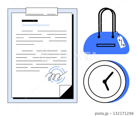 Document on a clipboard with a signature, a blue handbag with a price tag, and a clock displaying time. Ideal for office work theme, time management, retail, fashion, contracts, scheduling
