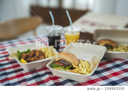 ペーパーフードコンテナに入ったチーズバーガーとポテト デリバリー・テイクアウト イメージ