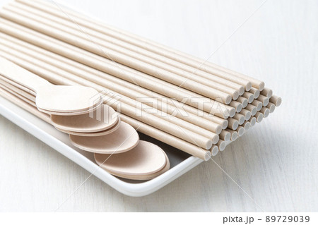 自然に優しい紙で作られた紙ストローと木製スプーン