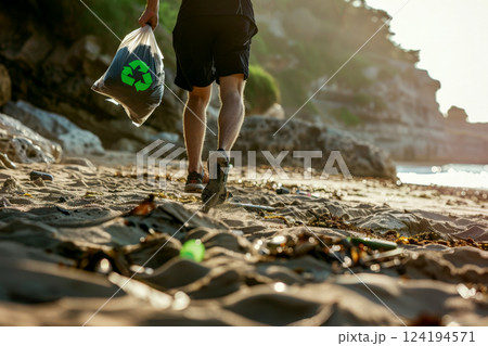 hands man runner holding a recycling trach bag filled with various recyclable items on beach ..Environment Day concept. Generative AI