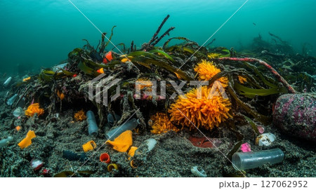 Seabed Covered in Seaweed, Plastic Waste, and Marine Life