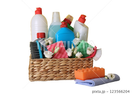 Spring cleaning, detergent bottles, brushes and rags in a wicker container isolated on a white background, PNG