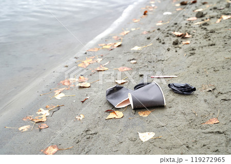 Environmental impact of littered coffee cup on sandy lakeshore with fallen leave