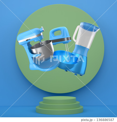 Electric kitchen appliances including mixer, blender and whisk floating on abstract background, concept of modern cooking tools
