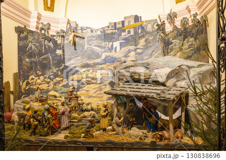 Nativity scene depicting the birth of Jesus with Mary, Joseph, shepherds and animals in Prague