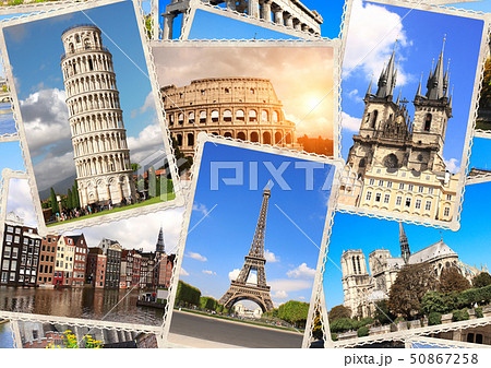 Vintage photos of european landmarks. Eiffel tower in Paris, Leaning Tower of Pisa, Colosseum in Rome, old houses in Amsterdam