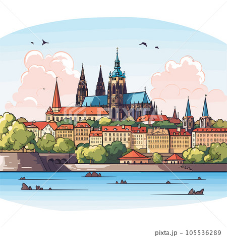 Prague Castle illustration in an doodle inca cartoon style. Simple minimalist drawing of Prague Castle