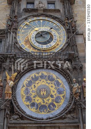 Prague, Czech Republic, August 7, 2023. The astronomical clock is one of the city's symbols. Close-up of the dials with gold details. Travel destinations.