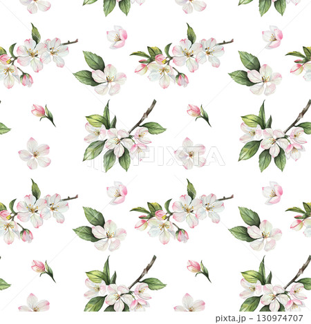 Seamless watercolor pattern with apple tree branches. Pink and white flowers with green leaves. White background. Botanical illustration of a tree, hand-drawn
