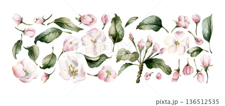 Apple blossom Set spring flowers bud branch. Cherry Sakura Blooming Watercolor hand drawn floral illustration isolated on white background Easter design fresh print cosmetic package porcelain crockery