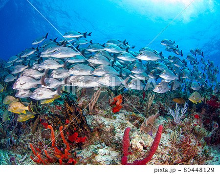 珊瑚礁で群れるセーラーズグラント(イサキの仲間) (プラヤ・デル・カルメン、メキシコ)