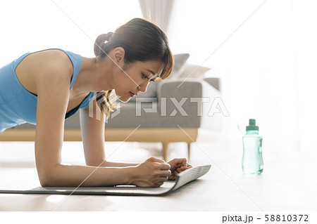 パーソナルジムで体を鍛える若い女性 筋トレ女子 腕立て伏せ プランク