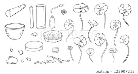 Centella asiatica, pennywort, glass flask and dropper bottle in set black white vector illustration on white. Gotu kola, wooden stand, stone mortar and drops hand drawn linear sketch for design label.