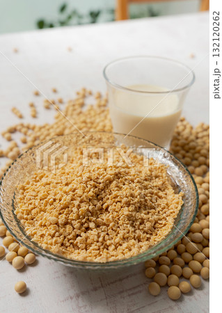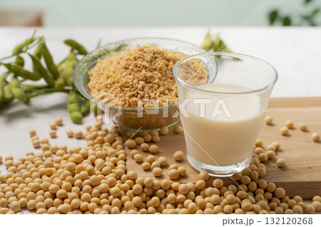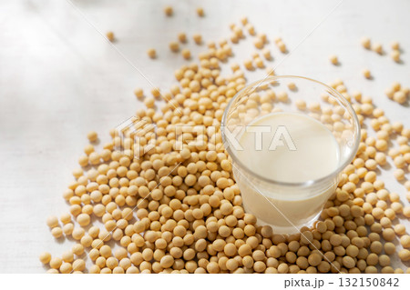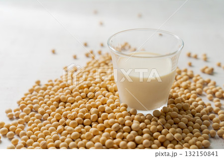 ガラスコップに豆乳を注ぎ込む瞬間と大豆