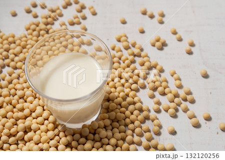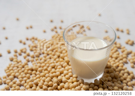 水色の背景に大豆と豆乳が注がれたガラスコップ