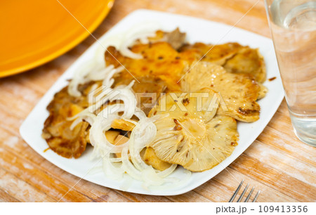 Homemade marinated white brittlegill mushrooms with onion
