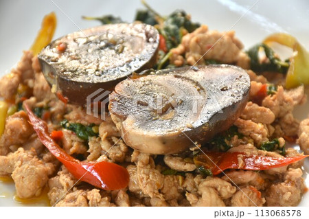 slice boiled black preserved egg dressing spicy fried chop chicken meat and basil leaf on plate