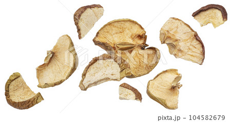 Falling dried apple slices isolated on white background