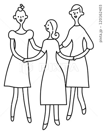 手をつなぐ3人の若い女性 モノクロ線画