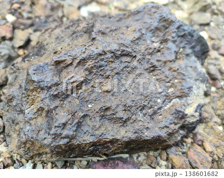 Close-up View of a Textured Brown Rock Surrounded by Gravel and Small Stones, Highlighting Natural Earth Elements and Varied Tones in the Landscape
