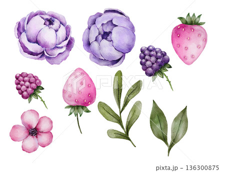 Watercolor floral and berry set with purple flowers pink strawberries and green leaves, soft pastel colors and simple shapes. Illustration for greeting cards, postcards, packaging labels, stickers or