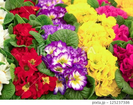 花壇に咲くカラフルな花(プリムラ)
