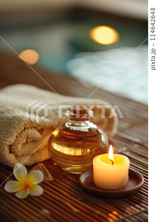 Serene Spa Ambiance with Candles, Towels, and Tropical Flowers