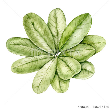 Watercolor plumeria shrub with green leaves, tropical plant foliage. Botanical illustration for jungle themed wallpaper, nursery decor, textile print, surface pattern, spa branding and tropical design