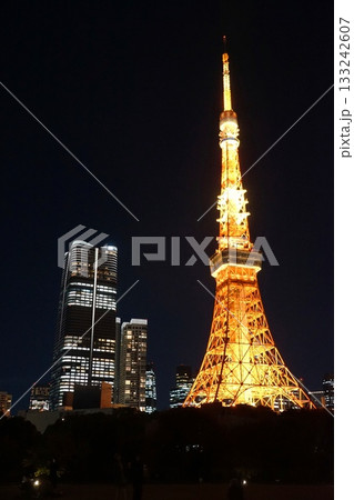 東京 港区 芝公園 プリンス芝公園から見た東京タワーと麻布台ヒルズの夜景