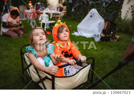 Children wearing Halloween costumes enjoying a wagon ride during a garden party