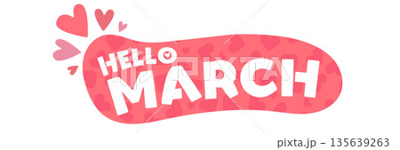 Hello March vector sticker with hearts frame, creative hand lettered seasonal label isolated on white, design element for scrapbooking and planners