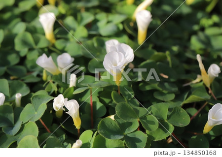 冬の庭に咲く白い小さなフヨウカタバミの花