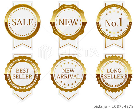 Golden luxury labels. Premium quality badges with golden stars and ribbons for product rating. Shiny stickers and seal for certificate vector set