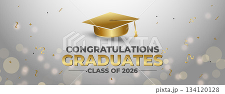 Elegant White and Gold Class of 2026 Graduation Banner with Cap and Confetti