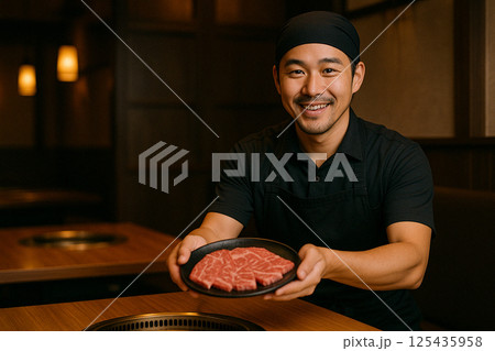 温かな雰囲気の焼肉レストランでの接客シーン