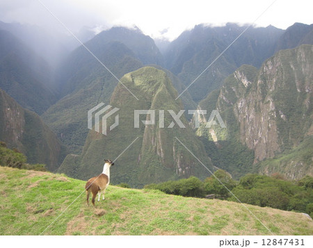 マチュピチュ内を散歩するリャマ(マチュピチュ山の入口、奥はアマゾン地帯)