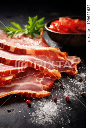 Delicious fresh thinly sliced pancetta with salt and spices on a dark background
