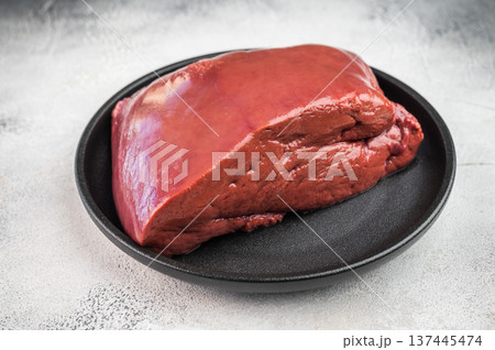 Fresh raw beef liver with smooth glossy surface served in skillet. Whole organ meat also known as veal calf liver