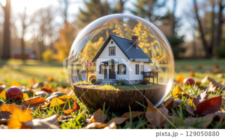 Miniature house inside glass sphere on autumn grass with colorful leaves and warm sunlight creating cozy atmosphere
