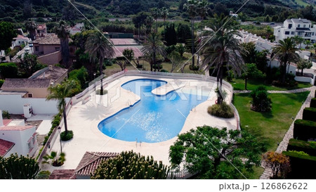 Aerial view of architecturally-designed modern prestige homes with pools in outer suburban Spain