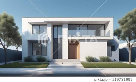 Modern single house with large windows, clean facade, and grey roof in front view. Minimal architecture projects.
