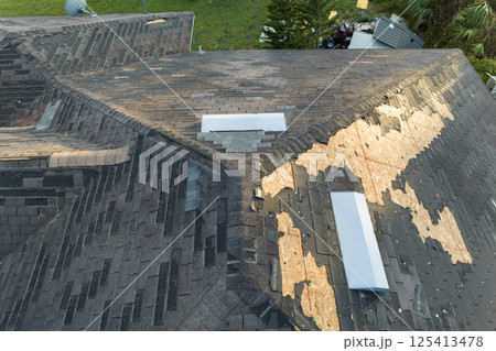 Consequences of natural disaster. Damaged house roof with missing shingles after hurricane in Florida