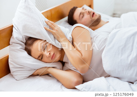 Snoring. Unhappy Girlfriend Trying To Sleep Near Snorting Boyfriend In Bed Indoor. Selective Focus