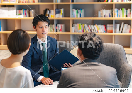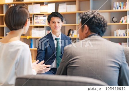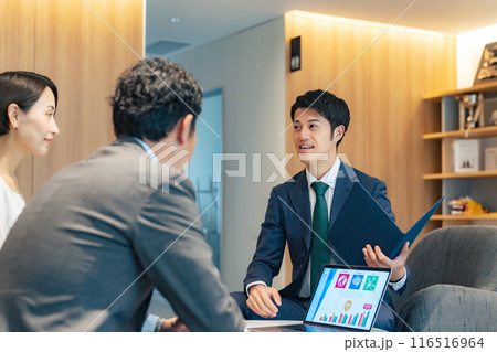 ロビーで会話するカップルと相談員