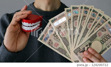 歯の模型と大量の一万円札を持つ人物