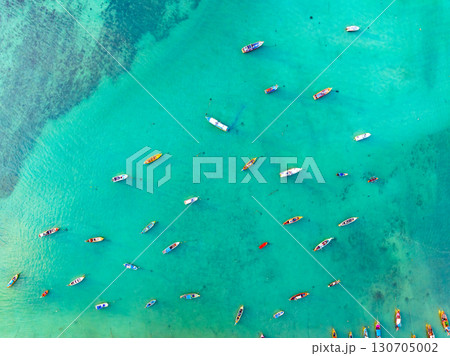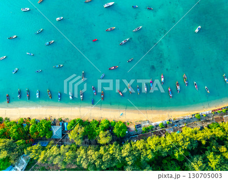 Aerial drone bird's eye view photo Top down of tropical sea with long tail fishing boats at phuket thailand