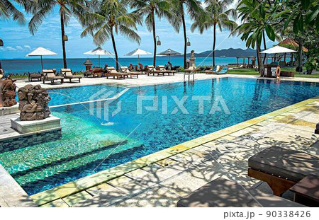 フィリピンのリゾートホテルのプールサイドとパラソル、デッキチェア
