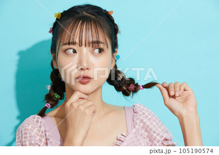 水着をきた若い女性の青背景のポートレート