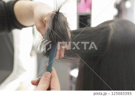クリップで髪の毛を留める美容師の手元とお客の横顔