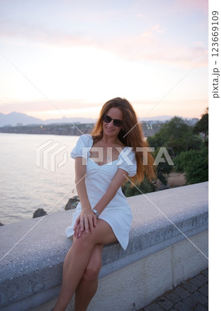 Woman in white dress enjoying peaceful sunset on seaside wall